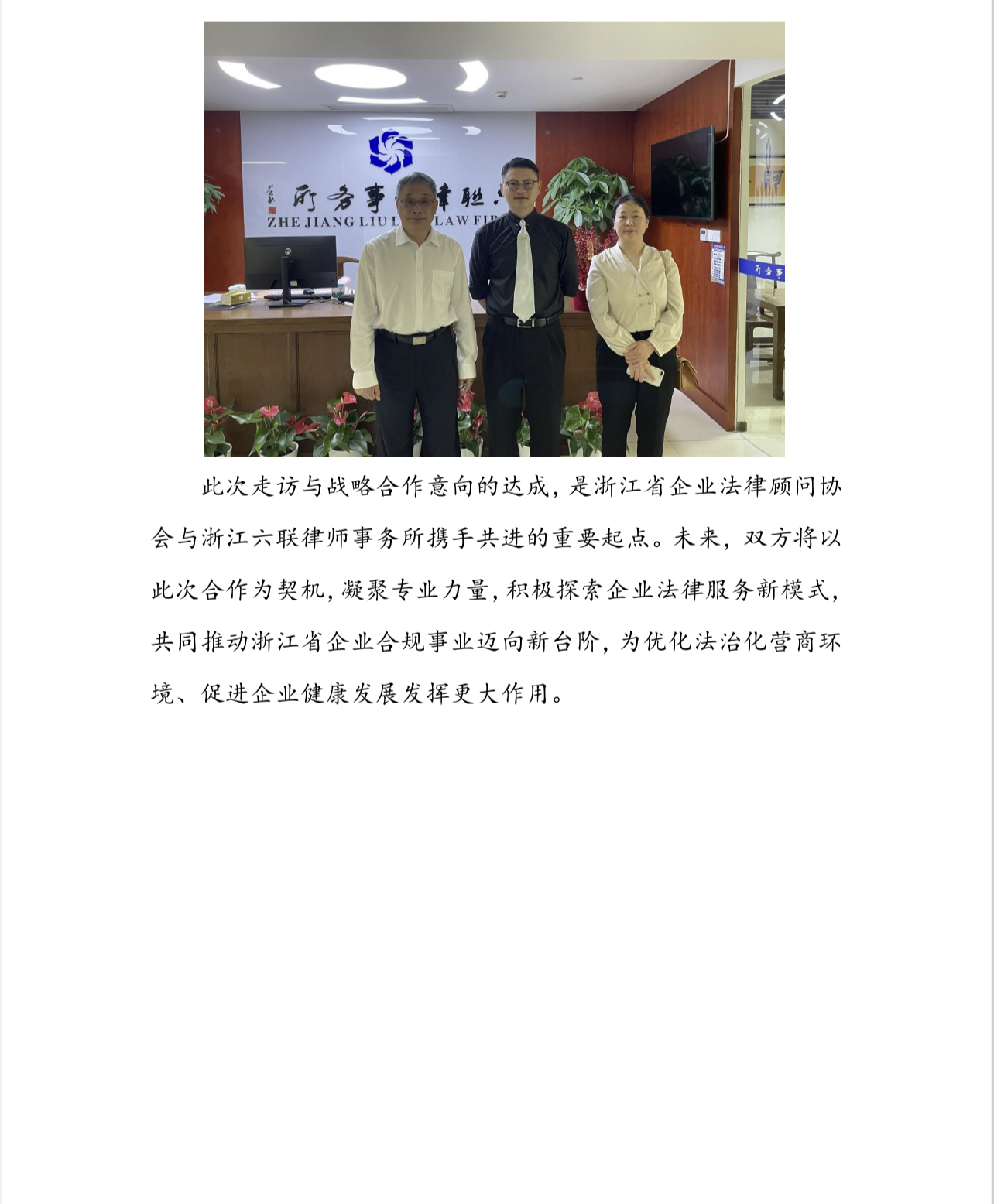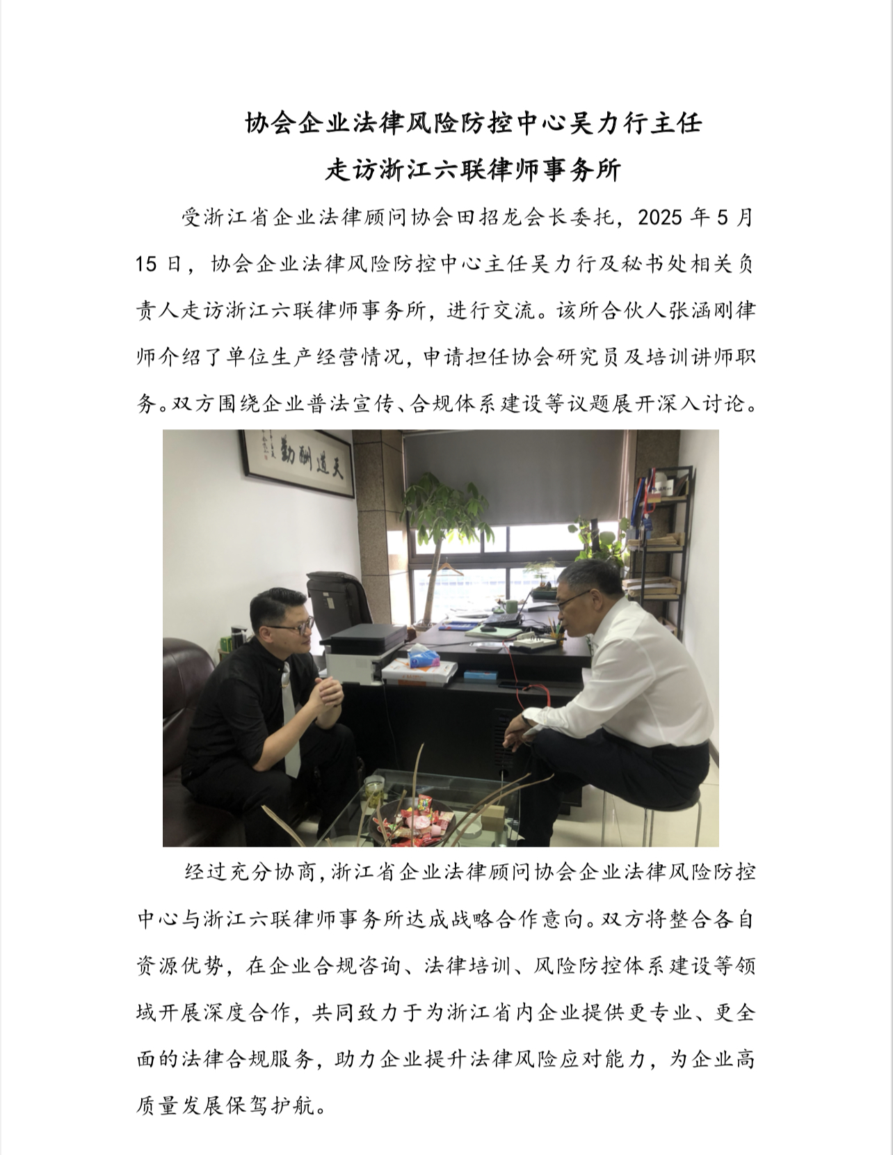 协会企业法律风险防控中心吴力行主任 走访浙江六联律师事务所